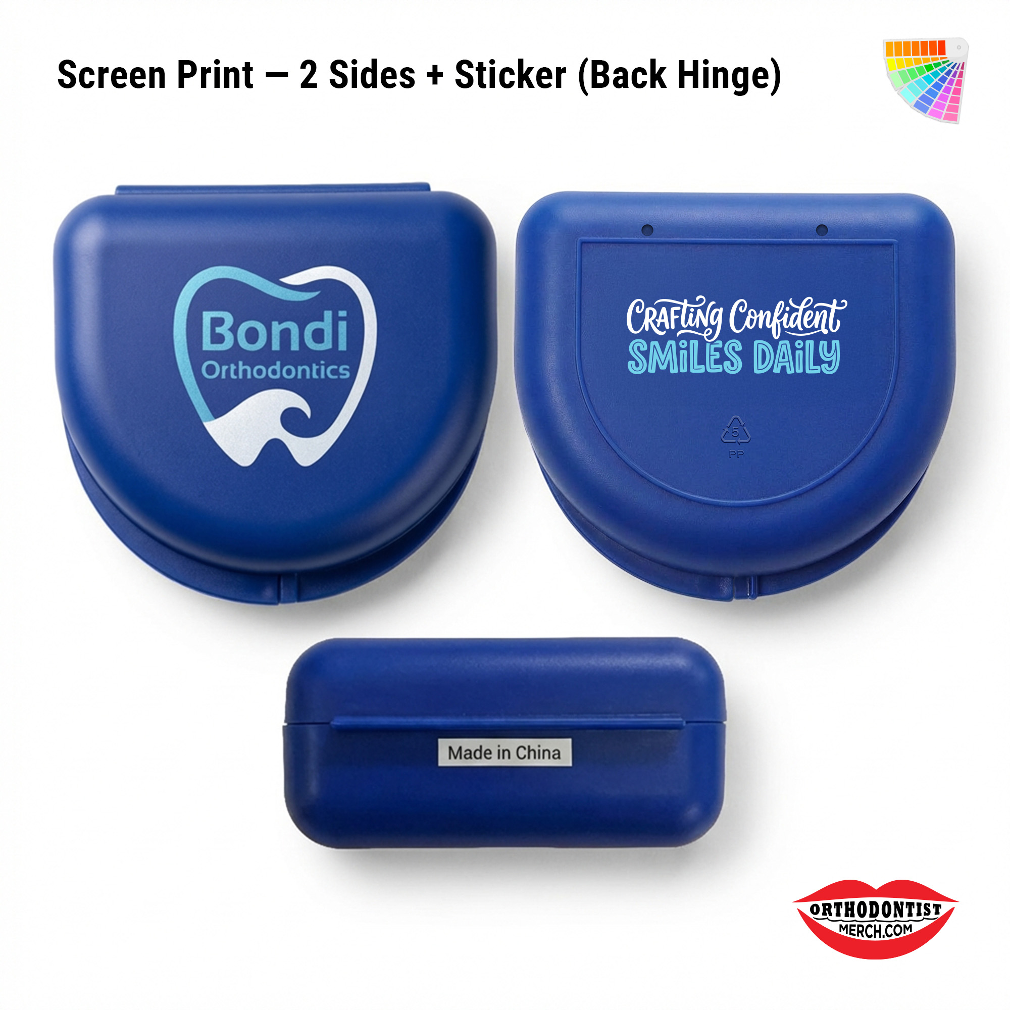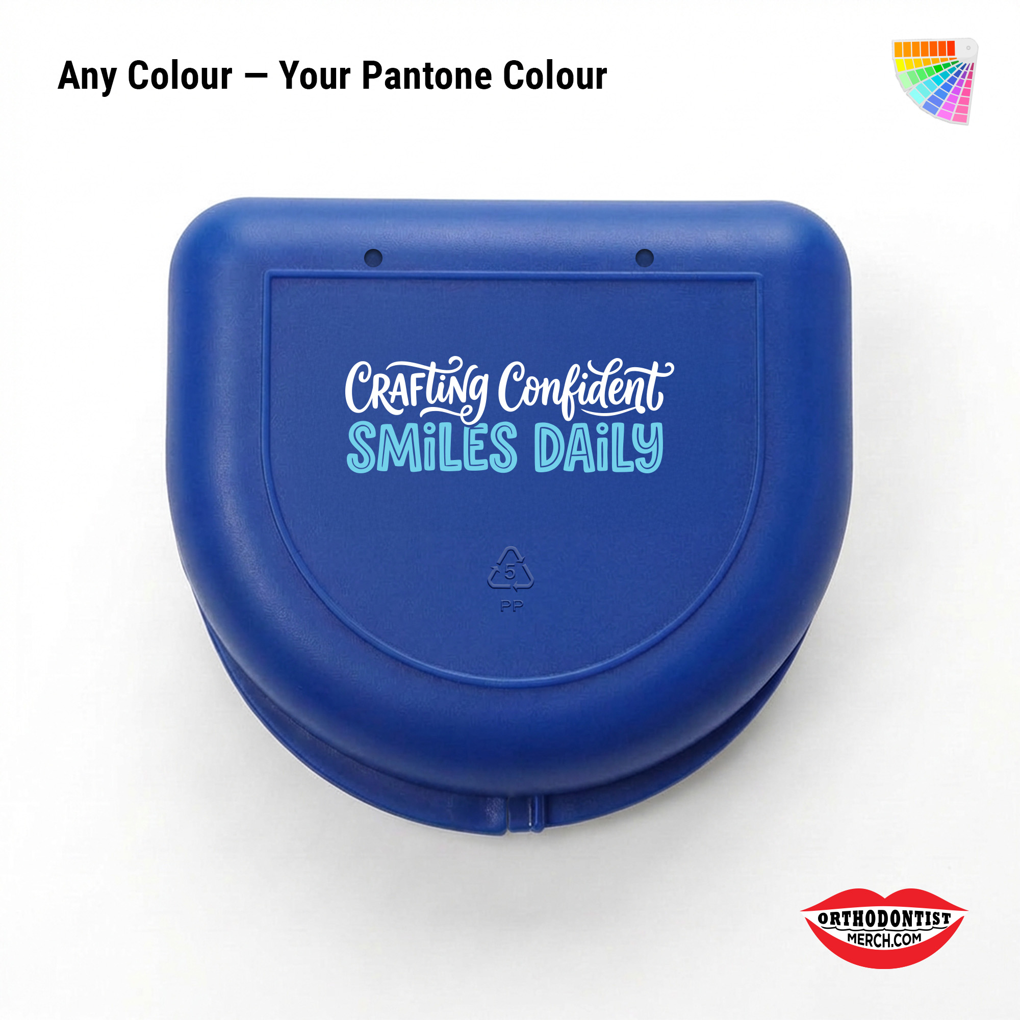 This beautiful Matt surface finish retainer case can be custom printed with your logo design. Your brand printed on these matt finish BPA Free retainer cases. These retainer cases can be manufactured in your pantone colour of choice to match your corporate image. A sticker label on the bottom designed for your patient to fill in their contact name and phone number should they be misplaced. These retainer cases are perfect for your patients to keep retainers clean for when ready to put on over their teeth next. They are also great for marketing your brand awareness to the market.