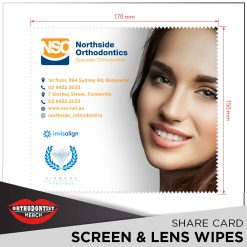 Custom printed with your logo design. This share card inserted in a nice clear pvc clear wallet with a high quality Microfibre screen and lens cleaning cloth in a clear PVC wallet comes branded full colour with your design, logo and contact details.This another perfect promotion for your Orthodontist practice.