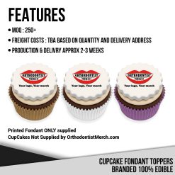 Elevate your cupcakes with our Cupcake Toppers Branded 100% Edible! These 100% edible toppers feature a 4cm fondant base topped with a vibrant, full-color print on an icing sheet. Perfect for adding a personalised touch to celebrations, events, or branded promotions. Cupcakes not included - we suggest you buy fresh cupcakes from your local cake shop and place your branded 100% edible logo topper on top for a delightful finish.